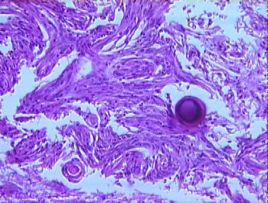 - Concentrically laminated hyaline psammoma bodies scattered throughout the lesion