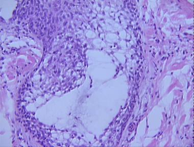 - Pools of mucin between the keratinocytes and the sebaceous glands